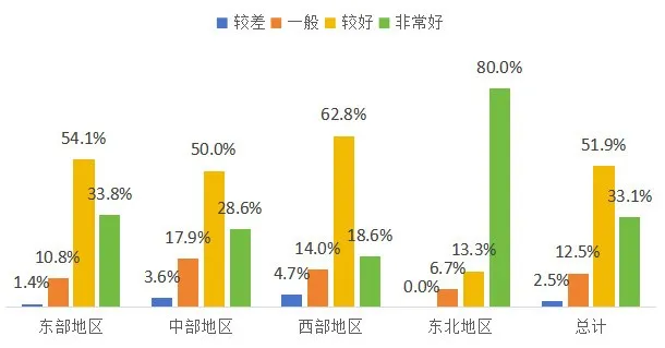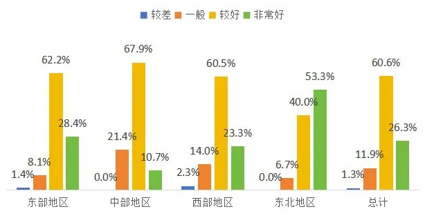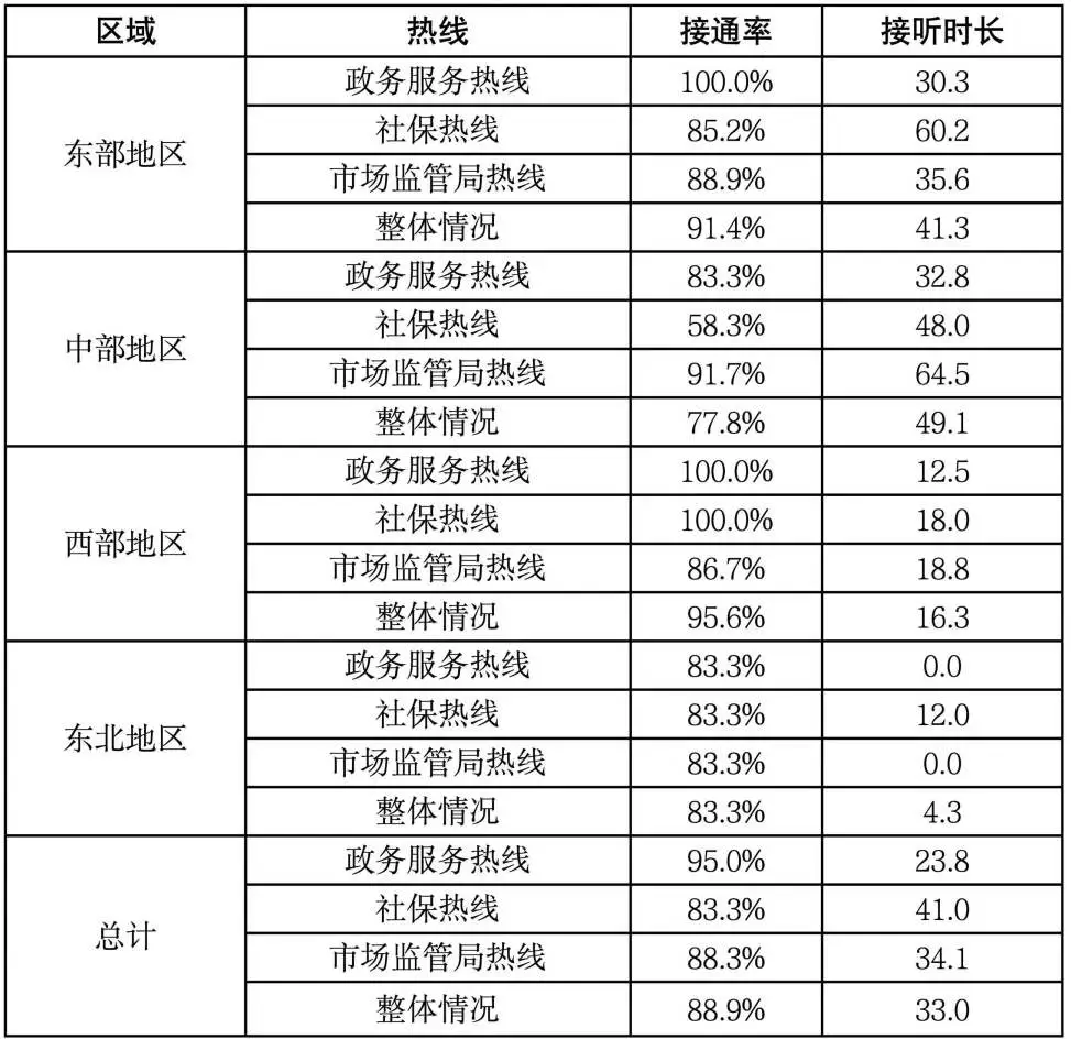 工作人員整體服務態度較好,政策熟悉度較高??傮w看,超過85%的熱線服務態度較好,對咨詢的問題能正確回應,耐心解答,對政策和業務流程講解清晰。相較而言,東部、東北地區工作人員服務態度、政策熟悉度較好。仍存在部分咨詢熱線接聽人員沒耐心、不清楚辦理流程等情況。