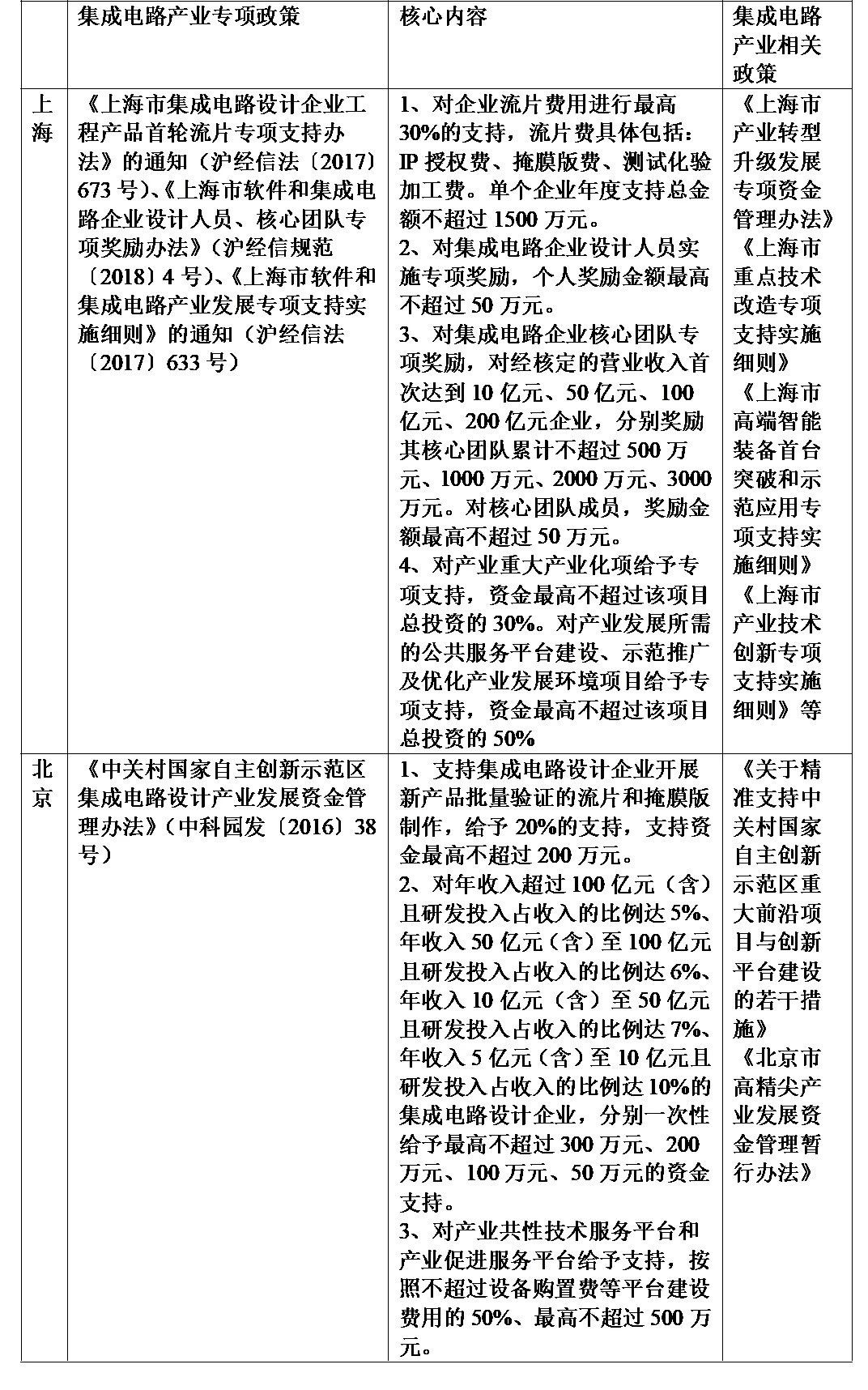 (3)產業政策比較。如表3所示,近幾年,北京和上海均針對本地的實際情況制定了相應的集成電路產業政策。從對比可以看出,上海的專項政策在整體支持力度和支持范圍上都優于北京,例如在流片補貼上最高支持總金額達到了1500萬元,而北京僅有200萬。另外上海還出臺了集成電路人才專項政策,對符合條件的集成電路企業核心團隊和人員實施最高不超過50萬元的個人獎勵,北京則沒有集成電路人才專項政策。特別要注意的是,國務院新批復設立的上海自貿試驗區臨港新片區近期出臺了可以稱作國內力度最大的集成電路產業政策,相比之下,北京在政策方面確實相形見絀。