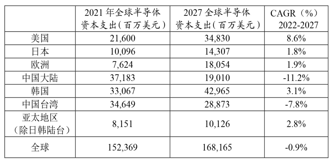 表2:2021-2027年全球半導(dǎo)體資本支出區(qū)域分布