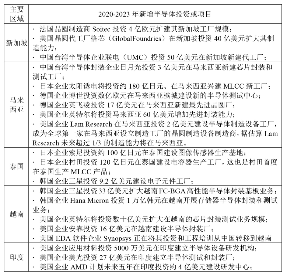 全球半導(dǎo)體產(chǎn)業(yè)集中在美國(guó)、中國(guó)大陸、歐洲、日本、韓國(guó)和中國(guó)臺(tái)灣六大區(qū)域,據(jù)相關(guān)數(shù)據(jù)顯示,2022年六大區(qū)域半導(dǎo)體產(chǎn)值占比超過98%。而新加坡、馬來西亞等地,雖然也有半導(dǎo)體產(chǎn)業(yè)的布局,但普遍處于產(chǎn)業(yè)鏈中低端,例如全球15%-20%的被動(dòng)元件產(chǎn)能布局在東南亞。近年來由于中美半導(dǎo)體貿(mào)易脫鉤加劇,國(guó)際地緣沖突等因素作用,進(jìn)一步催化全球半導(dǎo)體產(chǎn)業(yè)鏈分流和遷移,新加坡、馬來西亞、泰國(guó)、越南和印度等半導(dǎo)體“二線”區(qū)域正從半導(dǎo)體行業(yè)的全球布局調(diào)整中受益匪淺。主要特征:①美國(guó)、歐洲等國(guó)家和地區(qū)企業(yè)均以提高供應(yīng)鏈在面對(duì)國(guó)際地緣政治緊張局勢(shì)時(shí)的彈性為由,持續(xù)加大在新加坡等地的投資(見表3)。②根據(jù)Gartner的預(yù)測(cè),2021-2027年亞太地區(qū)(除日韓、中國(guó)的大陸和臺(tái)灣地區(qū)外)的半導(dǎo)體產(chǎn)業(yè)收入的年均復(fù)合增速將超過中國(guó)臺(tái)灣、美國(guó)、歐洲、中國(guó)大陸、日韓等傳統(tǒng)半導(dǎo)體“一線”區(qū)域,成為未來5年全球增長(zhǎng)最快的區(qū)域(見表4)。