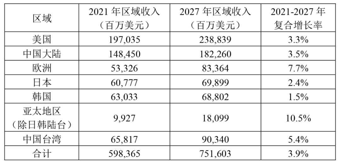 表4:2021-2027年全球半導(dǎo)體產(chǎn)業(yè)收入?yún)^(qū)域分布預(yù)估