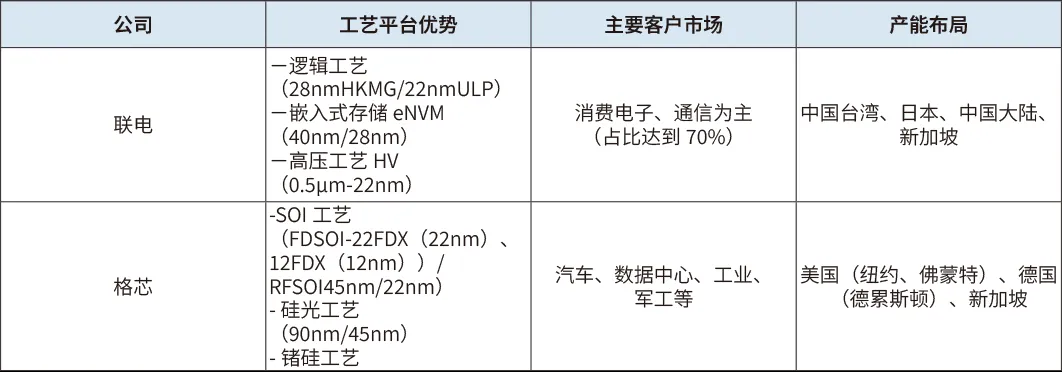 二是兩者制造工藝平臺與能力的互補性驅動。聯電、格芯均于2018年放棄先進工藝研發,將精力放在成熟工藝、特色工藝技術開發上。聯電以高性價比和多樣化特色工藝見長,尤其在邏輯工藝(28nmHKMG/22nmULP)、嵌入式存儲eNVM(40nm/28nm)、高壓工藝HV(0.5μm-22nm)領域優勢較為明顯,主要客戶以量大面廣的通信終端和消費電子類設計企業為主,占比高達70%。格芯近年來在工業、汽車市場的業務增速極快,其擅長的SOI工藝(FDSOI:22FDX、12FDX)、硅光工藝(90nm/45nm)、鍺硅工藝均為全球領先,部分工藝能力具備全球唯一性,與聯電工藝平臺高度互補和協同。