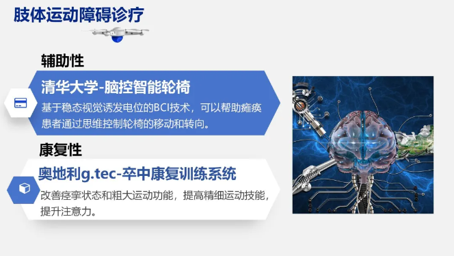 當(dāng)前的研究和應(yīng)用多為非侵入式,主要分為輔助性和康復(fù)性?xún)深?lèi),是業(yè)界進(jìn)展相對(duì)較快的領(lǐng)域。輔助性BCI著重于替代或增強(qiáng)物理功能,通過(guò)捕捉患者的運(yùn)動(dòng)意圖,進(jìn)而控制外部設(shè)備如假肢或外骨骼等。康復(fù)性BCI則專(zhuān)注于通過(guò)神經(jīng)康復(fù)訓(xùn)練恢復(fù)或改善患者的運(yùn)動(dòng)能力,利用中樞神經(jīng)系統(tǒng)的可塑性,通過(guò)重復(fù)性刺激來(lái)強(qiáng)化神經(jīng)元之間的突觸連接,促進(jìn)修復(fù)。
