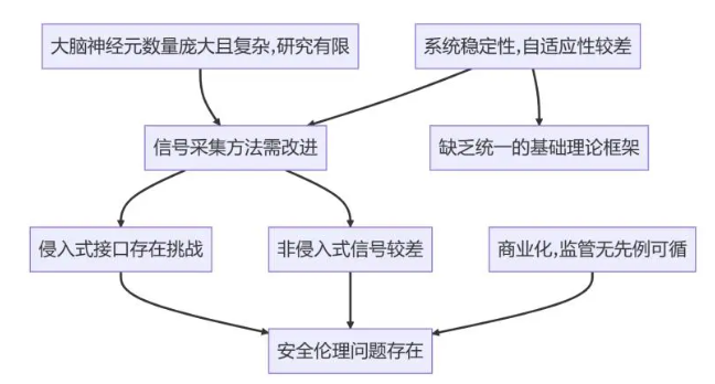 技術(shù)上仍有諸多局限性。BCI系統(tǒng)在信號(hào)采集、識(shí)別精度、處理速度、系統(tǒng)穩(wěn)定性和自適應(yīng)性方面仍存在不足。大腦的神經(jīng)元結(jié)構(gòu)極為復(fù)雜,對(duì)大腦工作機(jī)制和反饋刺激的研究還相對(duì)有限。人機(jī)交互界面操作復(fù)雜、訓(xùn)練周期長(zhǎng),針對(duì)不同患者的定制化研究難題亟待攻克。研發(fā)成本高昂、開(kāi)發(fā)周期長(zhǎng),技術(shù)成熟度和產(chǎn)品化仍有較長(zhǎng)距離。