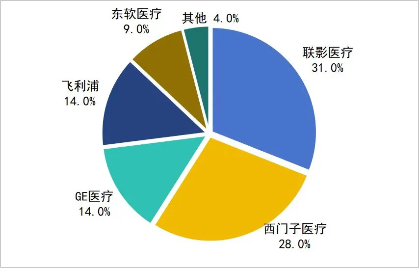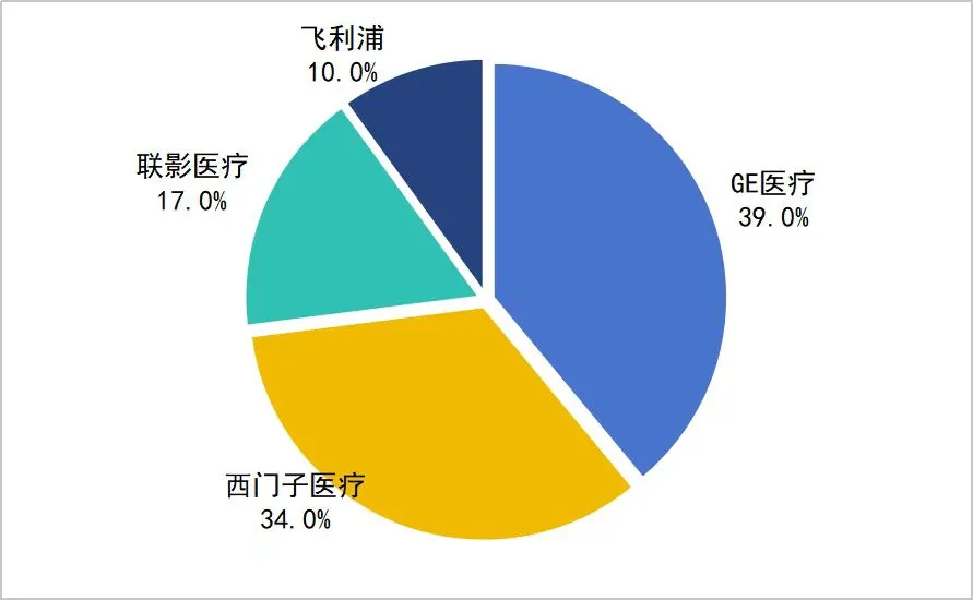 MR主要包括MR(1.5T)和MR(3.0T)兩種。其中,MR(3.0T)以其更高的信噪比、空間分辨率和掃描速度,極大提升了診斷精度,臨床應(yīng)用日益廣泛,占據(jù)MR總體市場超52%的市場份額,且市場份額高度集中,GE醫(yī)療(39%)、西門子醫(yī)療(34%)、聯(lián)影醫(yī)療(17%)三家企業(yè)合計(jì)市占率近90%。聯(lián)影醫(yī)療、東軟醫(yī)療加速入局本次醫(yī)療設(shè)備更新,提升MR國產(chǎn)化率,其中東軟醫(yī)療以1.5T產(chǎn)品為主,聯(lián)影醫(yī)療在主導(dǎo)1.5T市場份額的基礎(chǔ)上強(qiáng)勢進(jìn)軍3.0T市場。