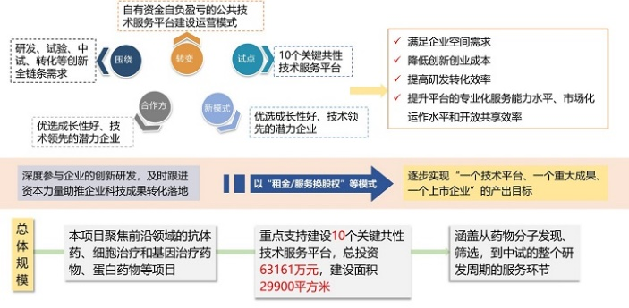 圍繞研發、試驗、中試、轉化等創新全鏈條需求,通過“活機制、強支持、促協同”的支持手段,建設生命科學園關鍵共性技術服務平臺,采用園區提供場地并主導投資建設、合作企業租用運營的模式進行推進,探索以“租金/服務換股權”等模式,深度參與企業的創新研發,及時跟進資本力量助推企業科技成果轉化落地,逐步實現“一個技術平臺、一個重大成果、一個上市企業”的產出目標,實現園區平臺與入駐企業共享共創共贏的發展模式,助力北京建設國際科技創新中心和成為擁有國際影響力的生物醫藥自主創新主陣地。