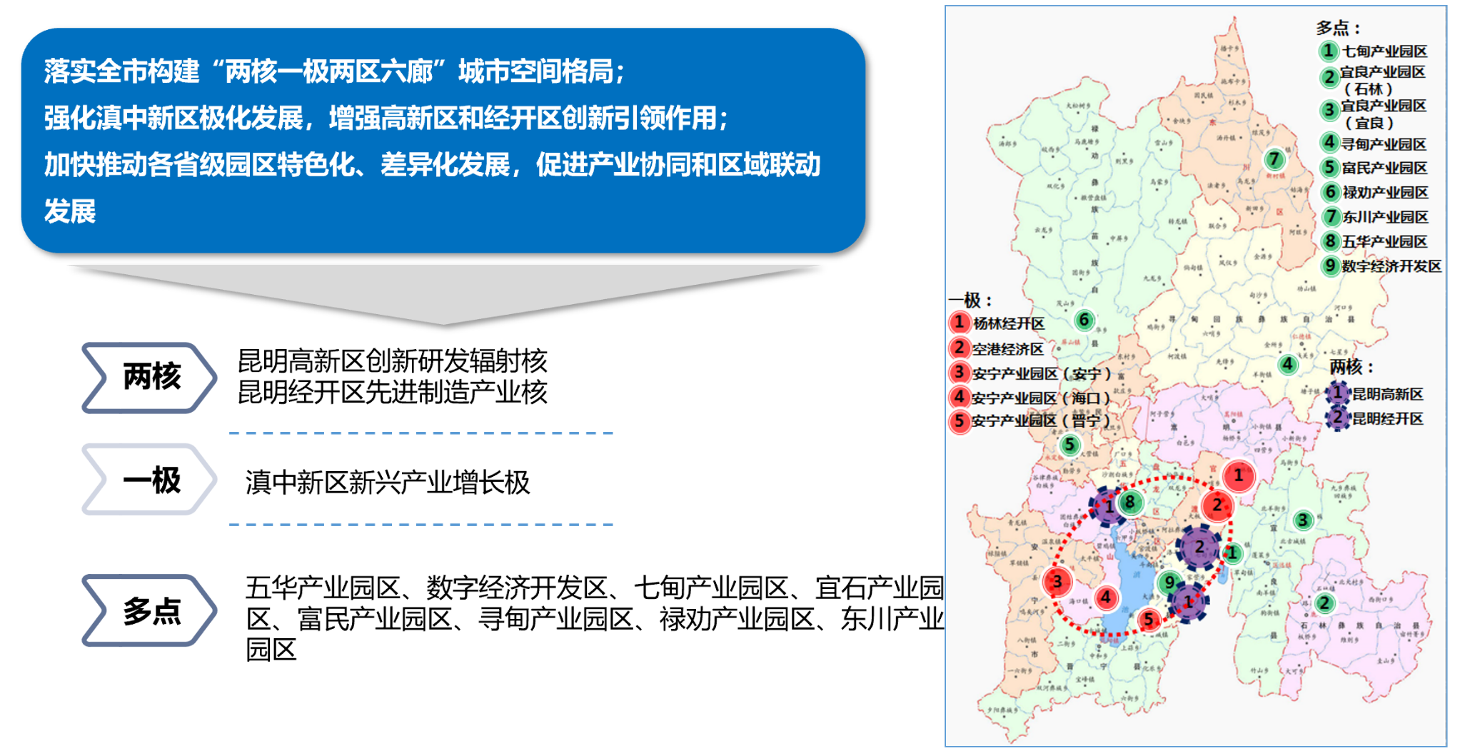 規(guī)劃貫徹習(xí)近平總書(shū)記考察云南重要講話精神,以服務(wù)昆明區(qū)域性國(guó)際中心城市建設(shè)目標(biāo),明確提出著力打造“兩核一極多點(diǎn)”空間格局;以?xún)?yōu)化“3+2+4”產(chǎn)業(yè)布局為主攻方向,培育九大工業(yè)產(chǎn)業(yè)集群的發(fā)展思路和舉措。